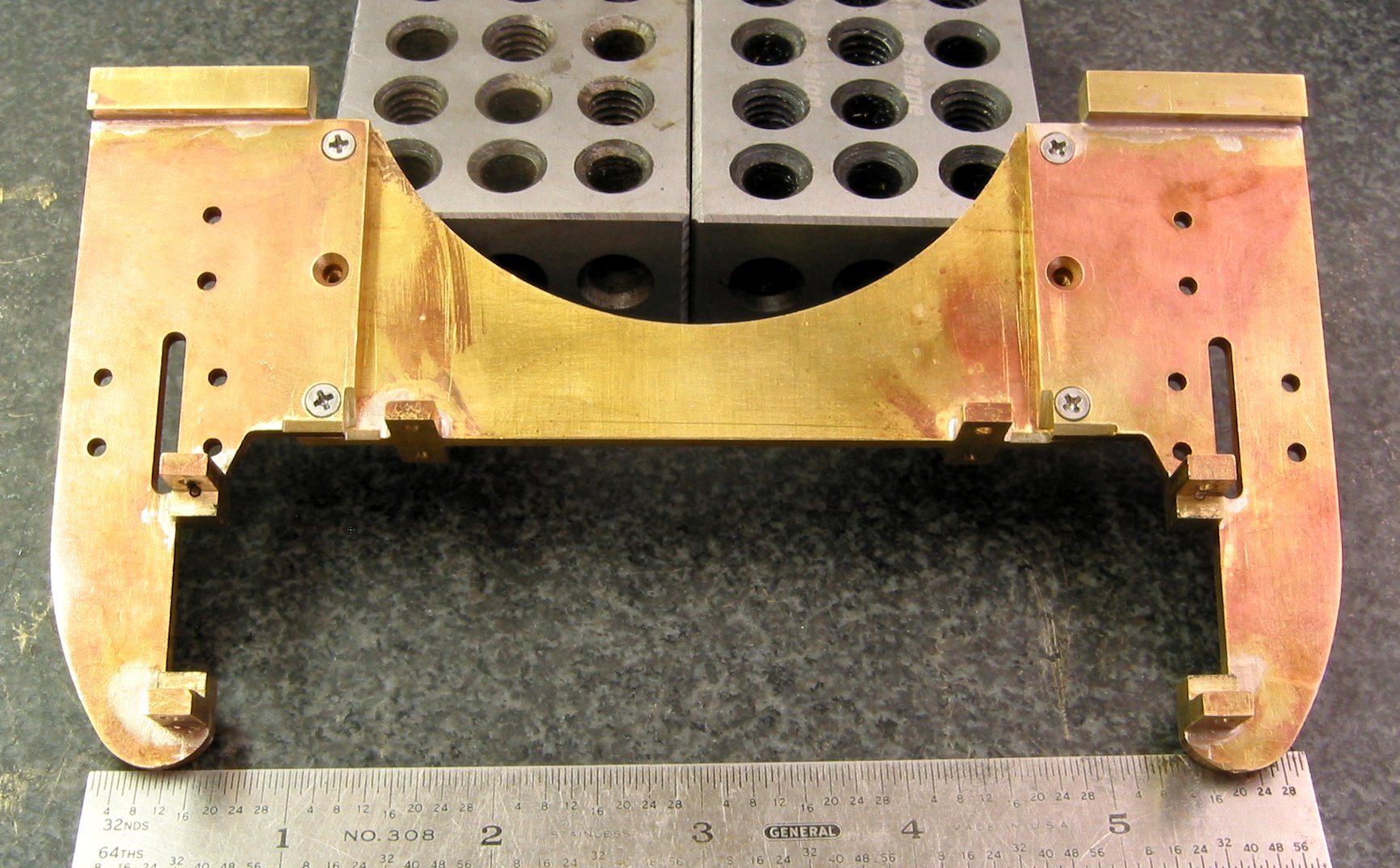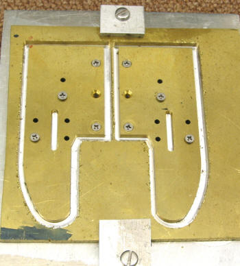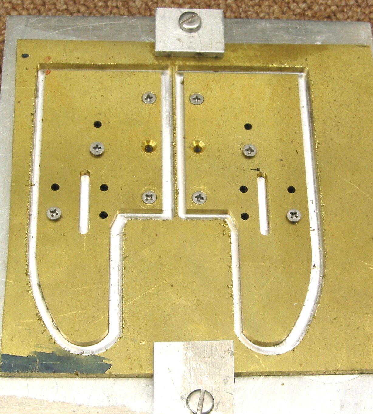 As you see this is the fixture I used to CNC the Guides Yokes. I put in a command to stop the process right after drilling the holes so that I could insert the screws. I used a 1/8" Carbide endmill ... took 6 trips. Total machine time about 15 minutes. Did the Tie Plate the same ... machine time 3 minutes or so.   Back to manual milling. The silver soldering was simple and straight forward. Cutting the gap was done very slowly with many checks.